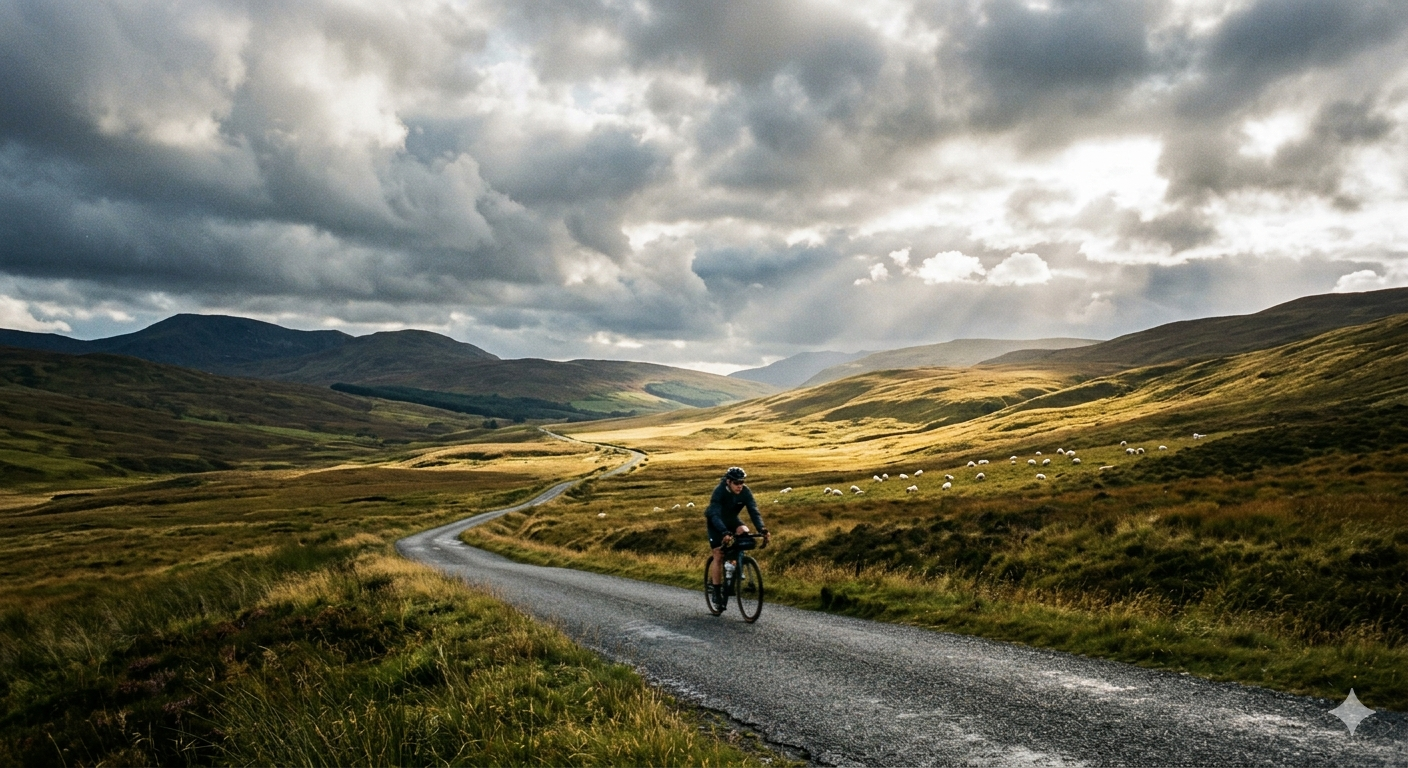 i ride beneath a restless sky light breaks through, then passes by it runs in waves across the land like something i
